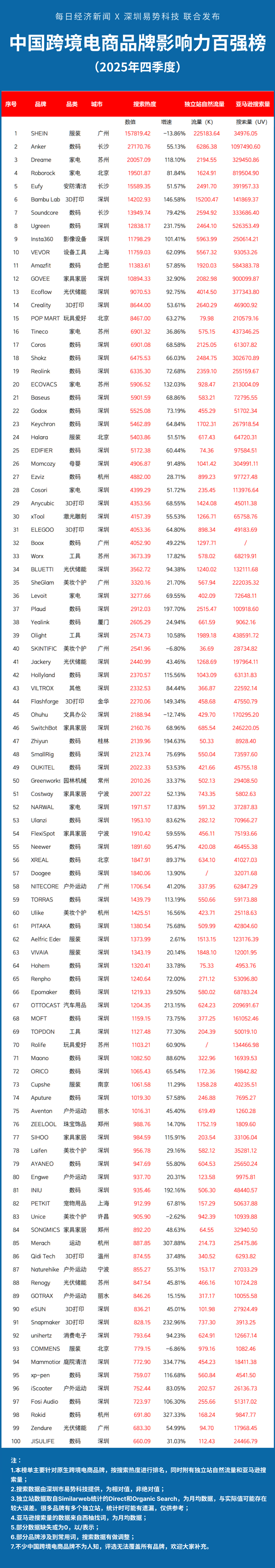 《中国跨境电商品牌影响力百强榜(2025 年第四季度)》显示,100 个上榜品牌中,95 个搜索热度同比正增长;增速高于 20% 的有 86 个,增速高于 50% 的有 66 个,增速高于 100% 的有 19 个,增速高于 200% 的有 6 个。