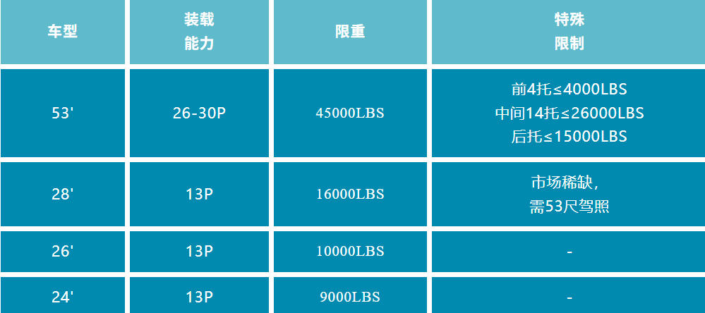 ANL自营车队涵盖多种卡车车型(24’26’28’53’),不同车型的道路限重也有所不同