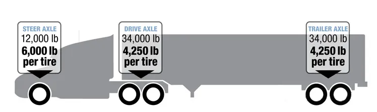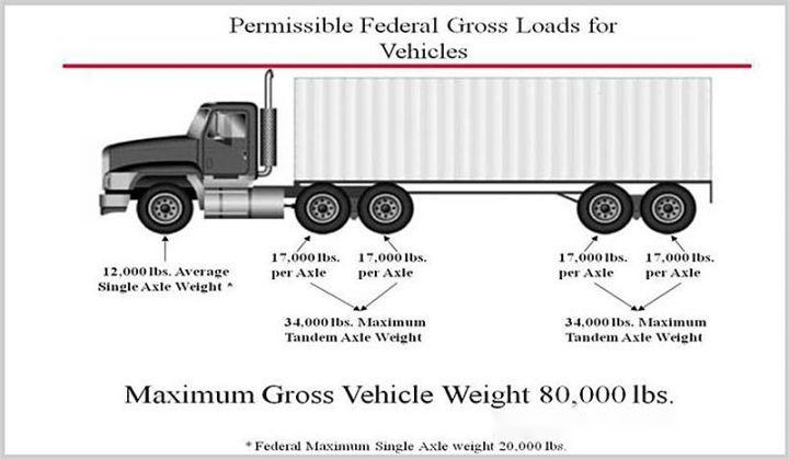 卡车头部在过秤时,重量不能超过12,000LBS,后两个轮胎则每个不能超过 34,000LBS。 如果装货时候存在装货不均的情况,使得某个/组轮胎的重量超重都可能会产生罚款。