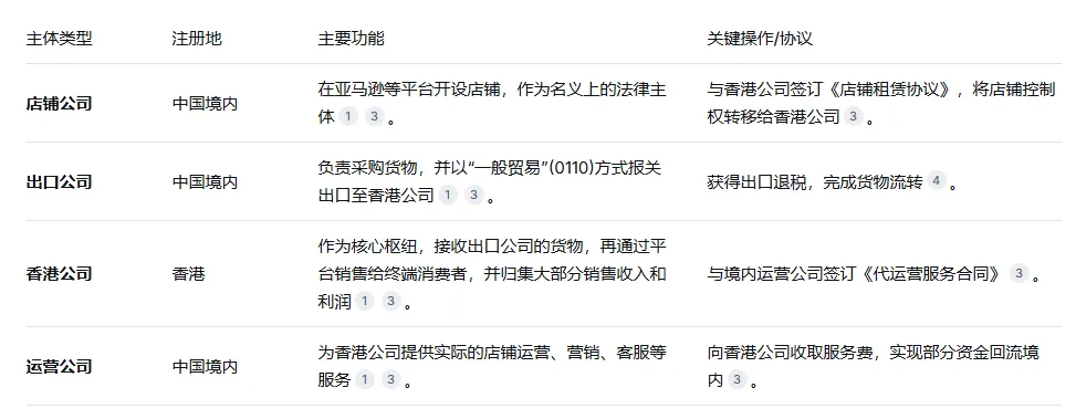 业务流程简述:境内出口公司将货物卖给香港公司并完成出口,香港公司通过平台店铺(名义上属于境内店铺公司)将货物零售给海外消费者。销售收入沉淀在香港公司账户,运营成本则以“服务费”等形式支付给境内运营公司。